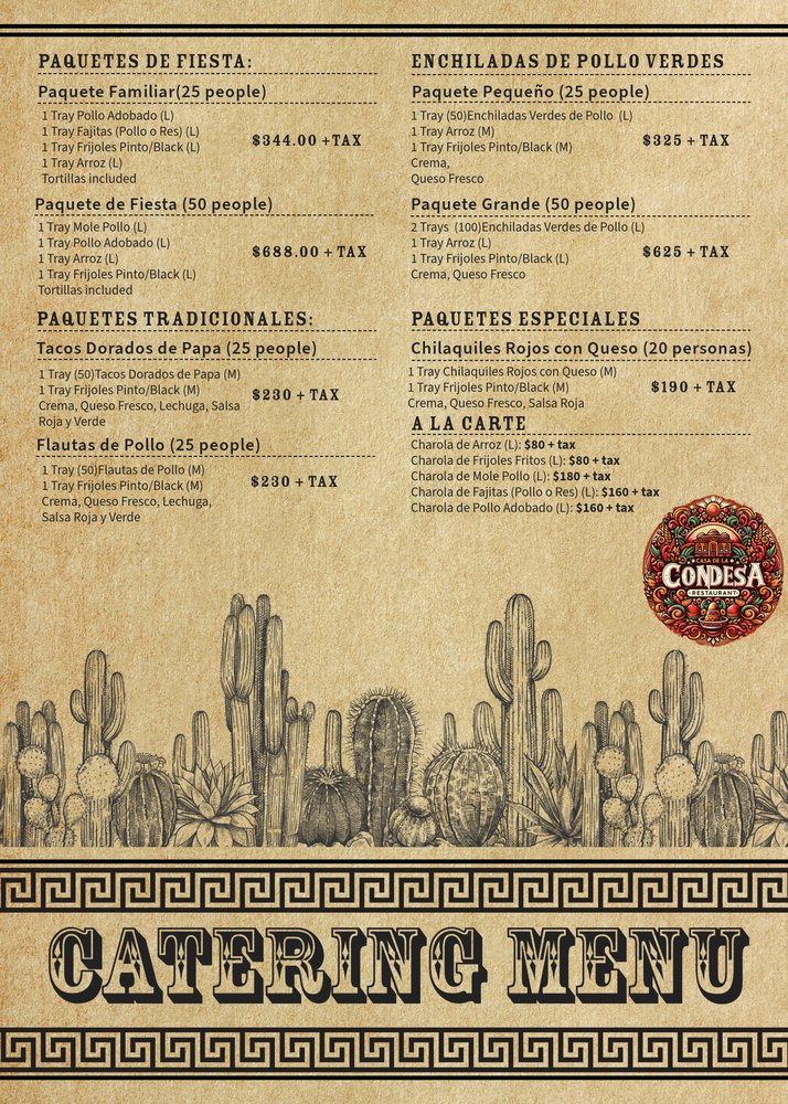12 tacos de papa con lechuga, crema y queso fresco 16 oz. arroz 16 oz. frijoles 12 oz. salsa rojo o verde.