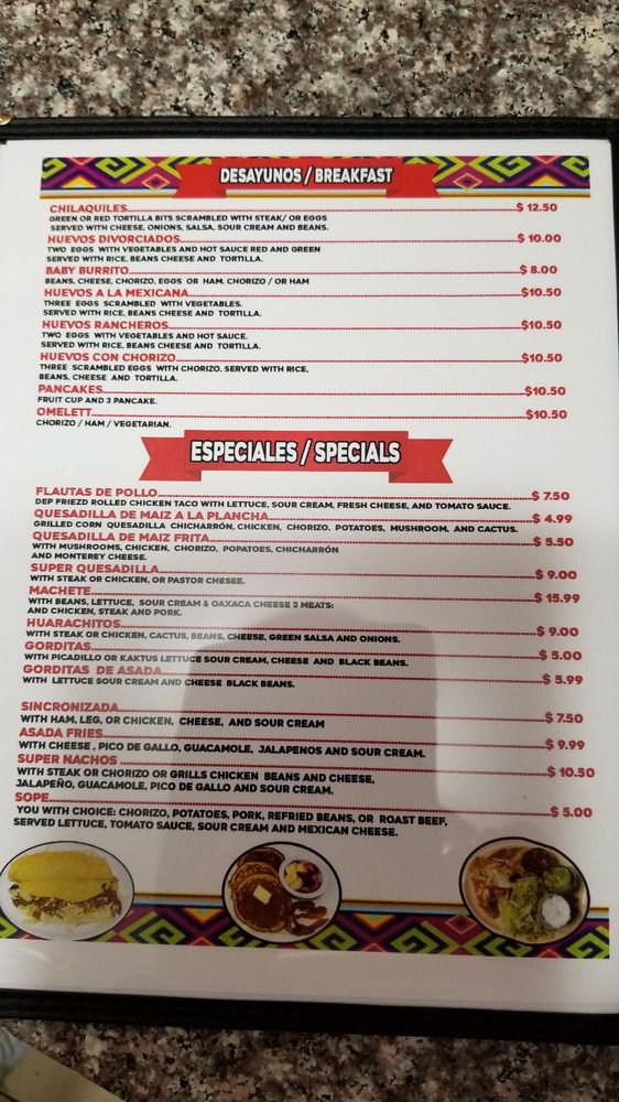2 eggs pan fried on top of tortillas one with our signature green salsa and the other red salsa with bell peppers and a side of rice and beans.